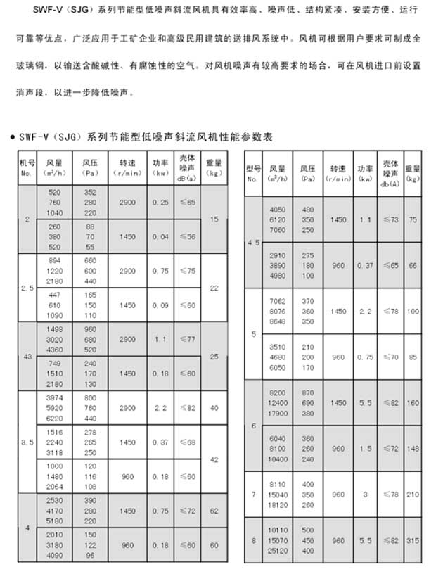 1、HTF型消防高溫排煙風(fēng)機 2、HTF(PYSWF)型高溫排煙混流風(fēng)機 3、HTFC消防通風(fēng)兩用柜式離心風(fēng)機 二、混流通風(fēng)機系列 1、SWF(HLF)型混流通風(fēng)機 2、SWF-IV(HL3-2A)型低噪聲節(jié)能混流通風(fēng)機 3、SWF-V(SJG)型斜流(混流)通風(fēng)機 4、HLF-6型低噪聲節(jié)能混流風(fēng)機箱 三、低噪聲軸流通風(fēng)機系列 1、T35-11(T40-11)型軸流通風(fēng)機 2、DZ型低噪聲軸流通風(fēng)機 3、DFBZ型壁式軸流通風(fēng)機 4、SDF型隧道式軸流通風(fēng)機 5、DWEX系列邊墻風(fēng)機 四、屋頂通風(fēng)機系列 1、DWT-I型軸流式屋頂風(fēng)機 2、DWT-II(III)型離心式屋頂風(fēng)機 3、DWT-IV型無動力屋頂風(fēng)機 4、RTC低噪聲離心式鋁制屋頂風(fēng)機 |